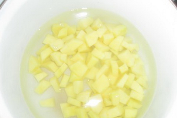 Couper les pommes de terre et les carottes en dés, verser de l’eau et cuire 20 minutes.