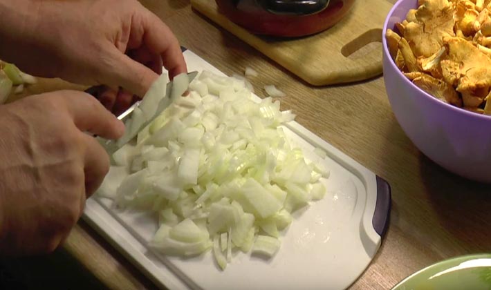 Les girolles bouillies sont tranchées et insérées dans l'oignon, frites pendant 15 minutes. à feu moyen.