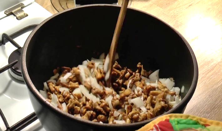 - Les oignons sont coupés en dés, les champignons en tranches, tous ensemble frits dans l'huile jusqu'à coloration dorée.