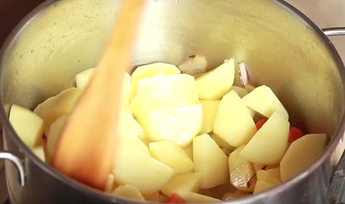 - Laisser mijoter pendant 10 minutes. et introduisez des pommes de terre en dés.
