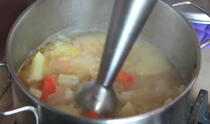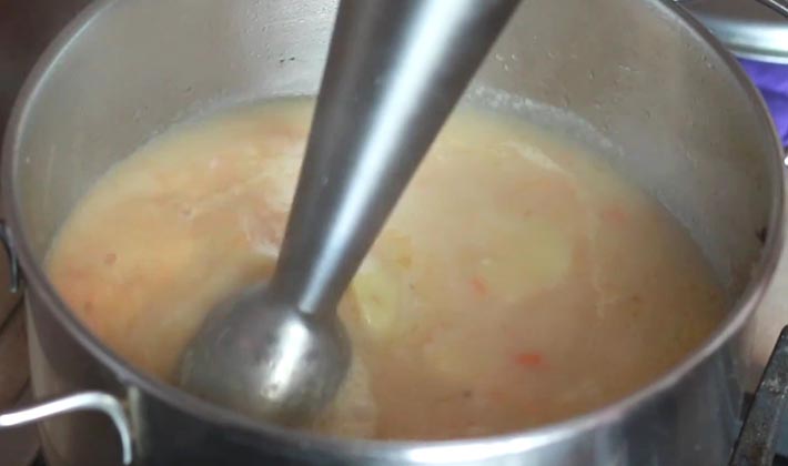 - Broyer avec un mélangeur submersible, puis verser la masse résultante dans le bouillon.