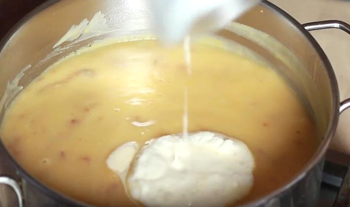- On verse la crème, on introduit le fromage à la crème et on porte à ébullition.