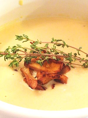 Une soupe crémeuse aux girolles et à la crème est préparée selon les étapes décrites ci-dessous.