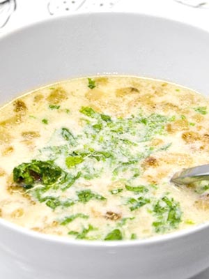- Verser dans des assiettes creuses, ajouter les verts hachés, ainsi que 2-3 chanterelles frites, servies à la table.