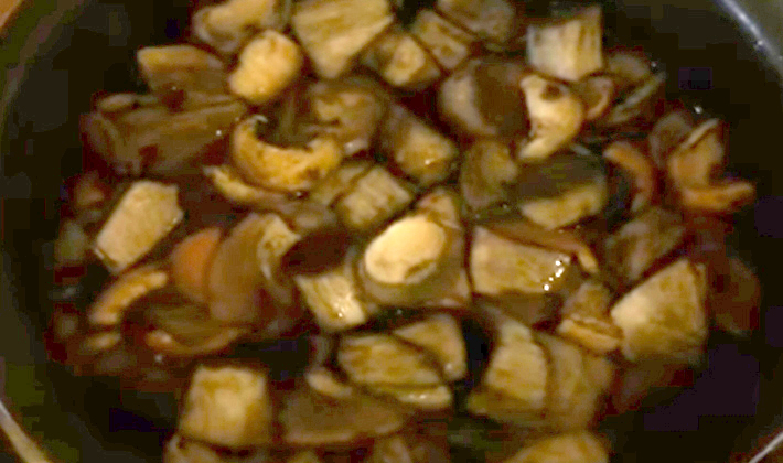 - Faites cuire à feu vif en ajoutant une petite quantité d'huile végétale jusqu'à ce que le liquide s'évapore complètement.