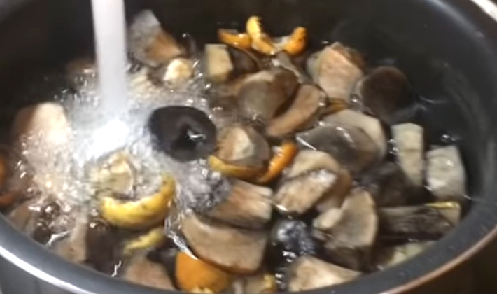 - Après le nettoyage préliminaire, les champignons sont bouillis dans de l'eau salée pendant 20 minutes.