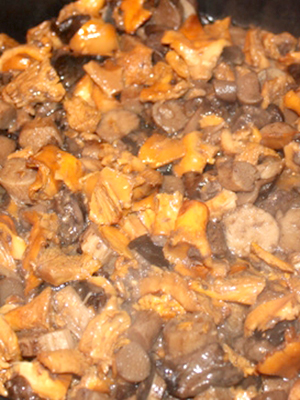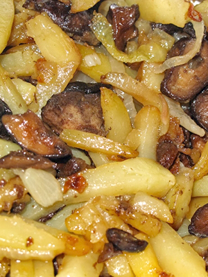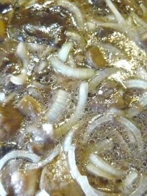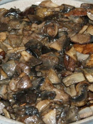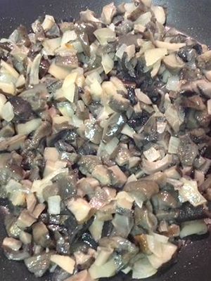 - Les champignons coupés en cubes, les rondelles d'oignon et les faire frire ensemble dans l'huile jusqu'à ce qu'ils soient dorés.