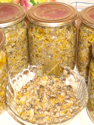 - Disposer dans des pots stérilisés, presser avec une cuillère et ajouter l'huile de la poêle. S'il n'y a pas assez d'huile, chauffez une nouvelle portion et versez dans des bocaux.