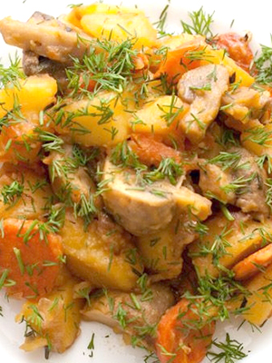 - Couper les tomates en tranches, mélanger avec les pommes de terre et les champignons, mélanger et mettre le tout dans un four.