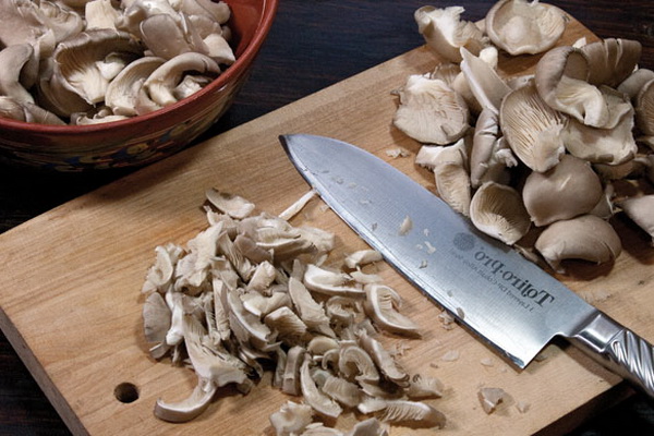 Les champignons à huîtres se désassemblent séparément, se rincent sous le robinet. Il vaut mieux les essuyer avec une éponge de cuisine humide et les couper en cubes moyens.