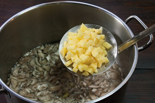 Les champignons à huîtres se désassemblent, coupent le mycélium restant, coupent les champignons en morceaux et les mettent dans l'eau bouillante. Laisser bouillir 15 minutes.