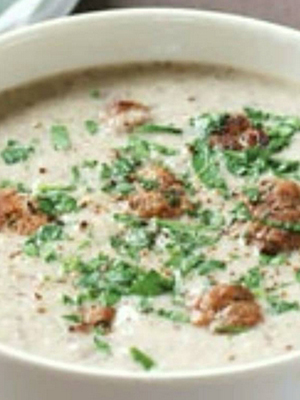 Puis égouttez le bouillon, le persil et le céleri, retirez les champignons dans un hachoir à viande (ou passez au tamis). Mélangez le tout avec le bouillon.