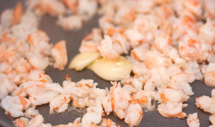 Ajouter les crevettes pelées, lavées et hachées finement, et bien mélanger.