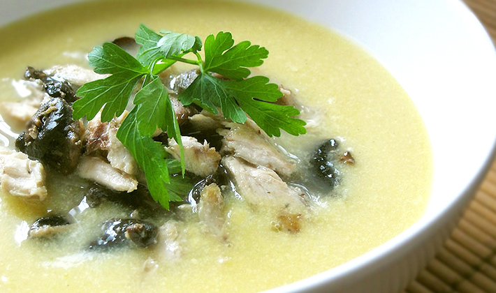 Couper le filet de poulet en tranches, faire tremper dans un mélange de protéines avec de l'amidon dilué dans de l'eau froide (1: 1) et faire frire jusqu'à formation d'une croûte pâle. Puis déposez sur un tamis et ébouillantez-les avec de l'eau bouillante pour éliminer les graisses. Bien rincer les champignons, les égoutter et les couper en tranches. Dans un bol profond, mettre les champignons, le poulet, verser le bouillon préparé et le bouillon de champignons, amener à ébullition. Retirez la mousse et versez un amidon dilué avec de l'eau (1: 2), de la graisse de poulet fondue. Verser dans un bol à soupe et servir.