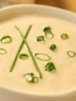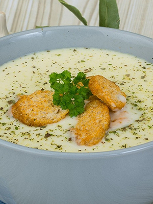 Battre les blancs d'œufs à la fourchette (ou au fouet), ajouter la crème et, en remuant continuellement à l'aide d'un filet, introduire le mélange dans la soupe. Après cela, sel au goût, réchauffer au bain-marie à une température ne dépassant pas 70 ° C
