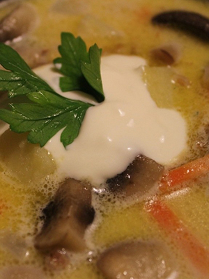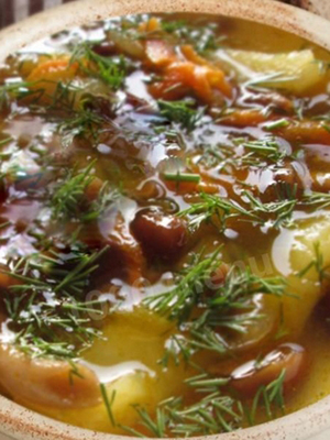 - Lorsque vous servez une soupe aux champignons et au champignon sur du bouillon de bœuf, saupoudrez d'herbes hachées et assaisonnez avec de la crème sure au goût.