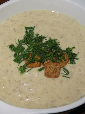 Pour préparer une délicieuse purée soupe-champignon sur du bouillon de poulet, vous devez faire frire les oignons émincés dans une casserole. Ajouter les champignons soigneusement lavés et hachés et faire frire pendant 5-10 minutes en remuant continuellement. Ensuite, sans retirer du feu, sous agitation constante, ajoutez la farine, versez le bouillon et laissez cuire 40 à 50 minutes à feu doux.