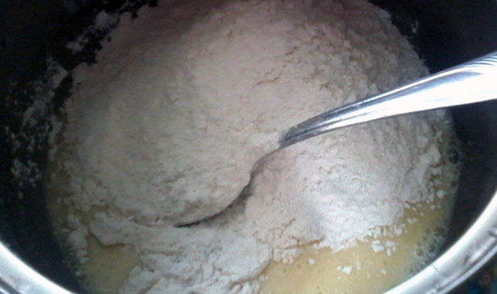 - Versez du sel à votre goût, mélangez et ajoutez de la farine, en la répartissant uniformément sur toute la surface.