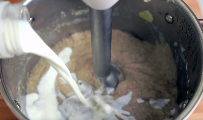 - Broyer la masse avec un mélangeur submersible jusqu'à l'obtention d'une consistance homogène, salez-la si nécessaire au goût.