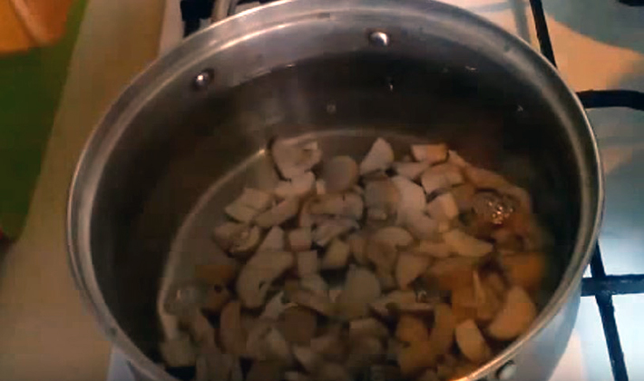 - Verser le bouillon de poulet dans la casserole, laisser bouillir, mettre les champignons émincés avec les oignons.