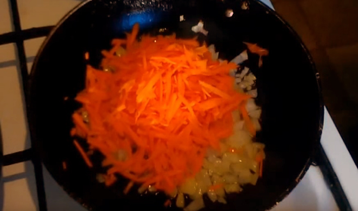 Peler les carottes et les oignons, les laver, les couper avec un couteau et les faire frire dans une petite quantité d'huile jusqu'à ce qu'ils soient dorés.