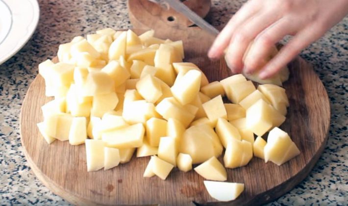 - Épluchez, lavez et coupez les pommes de terre avec des cubes moyens, ajoutez de l'eau et laissez cuire 15 minutes.