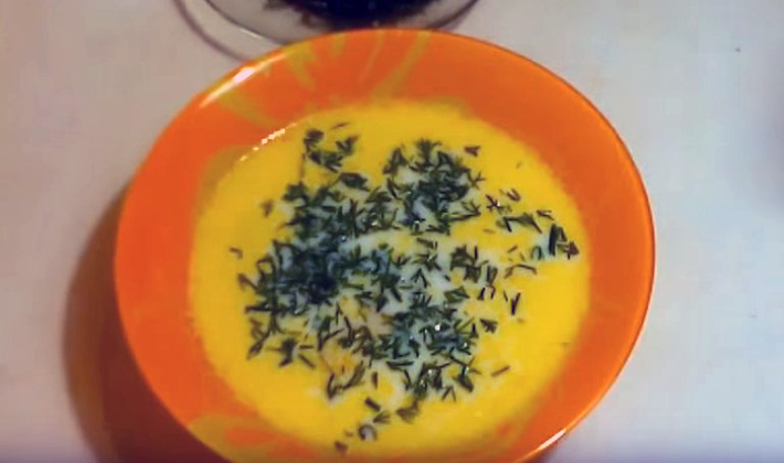 - Coupez le fromage à la crème en dés, ajoutez-le à la soupe et versez immédiatement la crème.