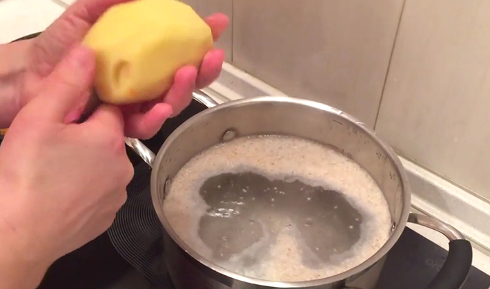 Les pommes de terre sont déposées dans le bouillon de champignons et bouillies à mi-cuisson à feu doux.