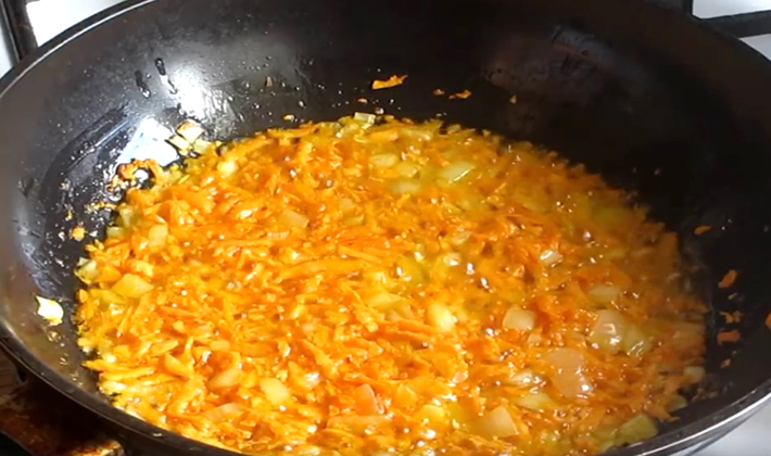 Dans une poêle à frire dans l'huile, faire revenir les oignons pendant 3 minutes, ajouter les carottes et les faire revenir jusqu'à ce qu'ils soient dorés.