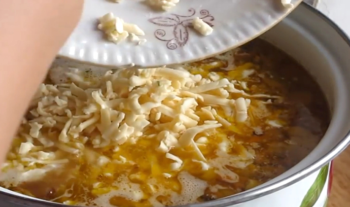 - Couper le fromage en petits cubes, plonger dans la soupe bouillante et cuire jusqu'à ce qu'il soit complètement dissout.
