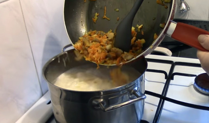- Faites frire les champignons et les oignons émincés au bain-marie pour 30 g de beurre jusqu'à ce qu'ils soient dorés, saupoudrez de farine et remuez avec une cuillère en bois jusqu'à ce que la masse devienne brune.