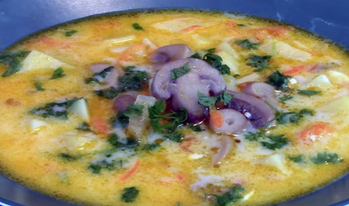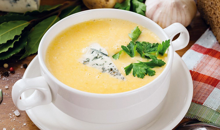 - Soupe au fromage avec légumes, champignons, fromage à la crème et craquelins