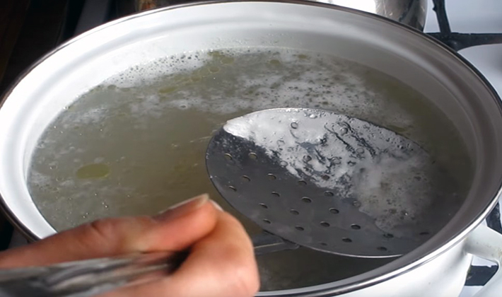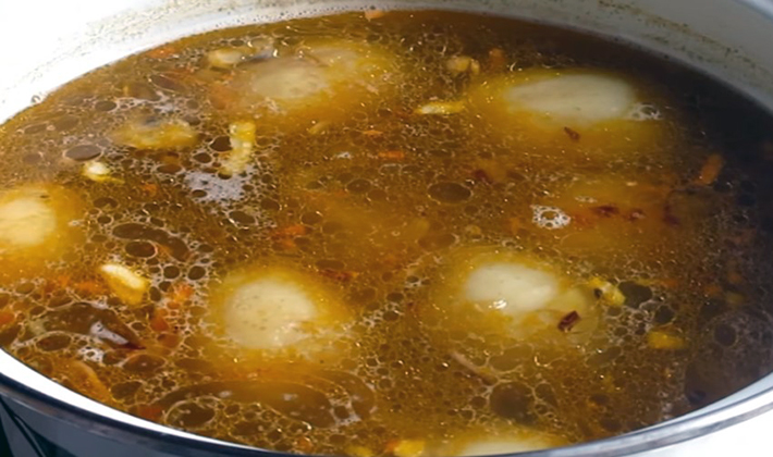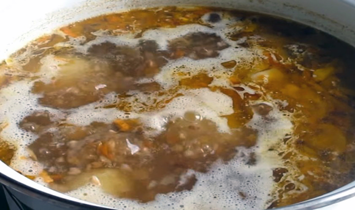 - Versez l'eau dans laquelle les champignons ont été trempés dans une casserole (elle deviendra la base de la soupe).
