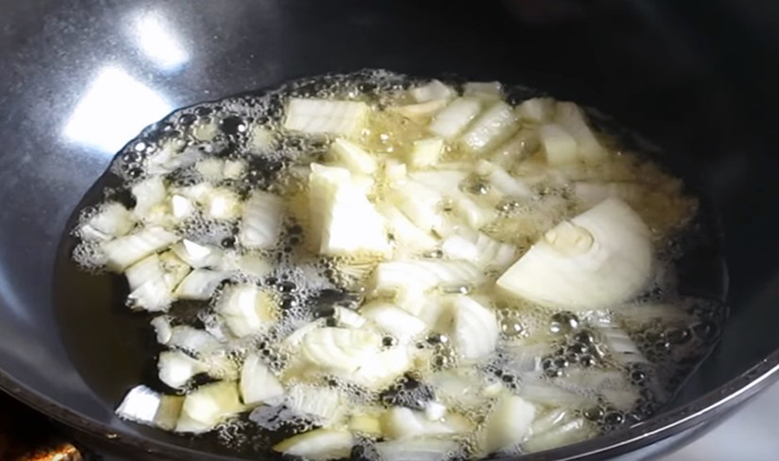 - Faites chauffer une petite quantité d'huile d'olive dans une casserole, mettez les oignons coupés en cubes.