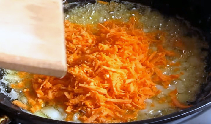 - Peler l'oignon, hacher, peler les graines, couper en nouilles, mettre dans une casserole avec du beurre et faire frire jusqu'à coloration.