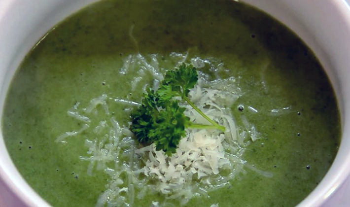 - Versez un peu de bouillon, mélangez tous les ingrédients dans le reste du liquide, faites bouillir pendant 5 à 7 minutes., Broyez avec un mélangeur à immersion.