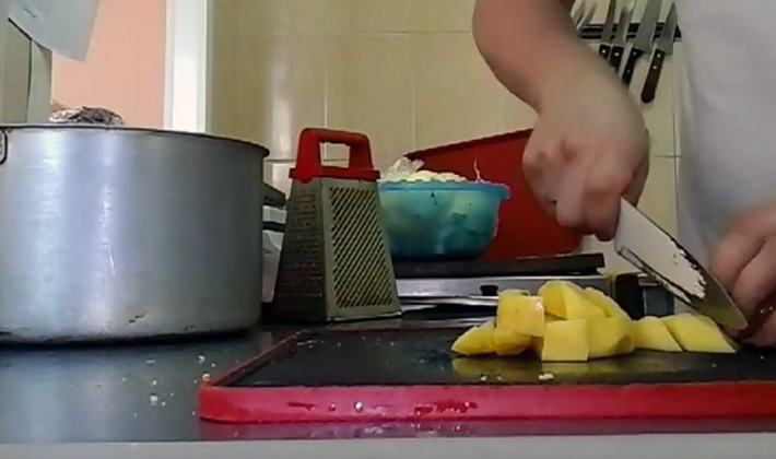 - Couper les champignons en lanières, hacher l'oignon avec un couteau, couper les pommes de terre en cubes.