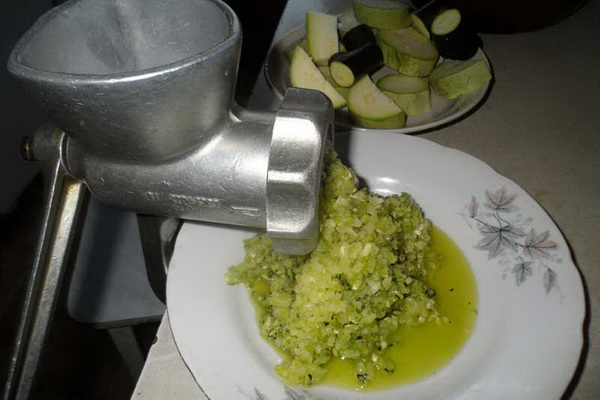Pelez les courgettes de la peau et des pépins, coupez-les en morceaux, broyez-les dans un moulin à viande et égouttez-les du jus.