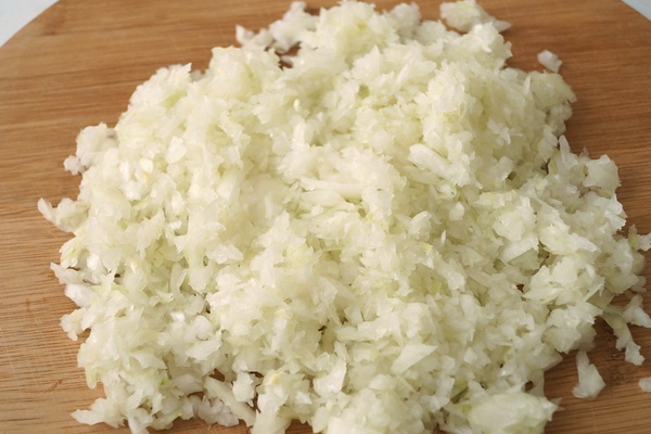 Épluchez et râpez l'oignon avec de petites divisions.