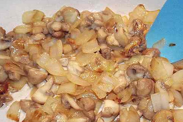 Moudre les poivrons, les oignons, les peler et les mélanger avec des champignons émincés.