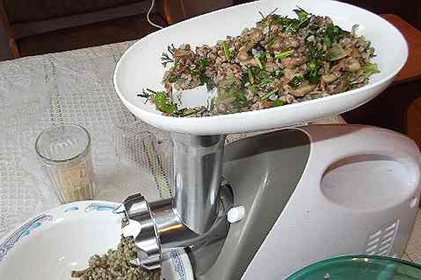 Bouillie de sarrasin bouillie avec des champignons bouillis pour passer dans un hachoir à viande.