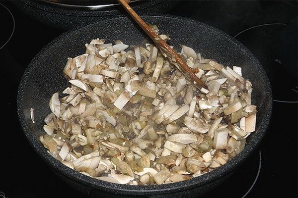 Couper les champignons préparés en petites assiettes, les oignons en cubes, faire revenir ces deux ingrédients dans une casserole à l'huile de tournesol jusqu'à coloration dorée.