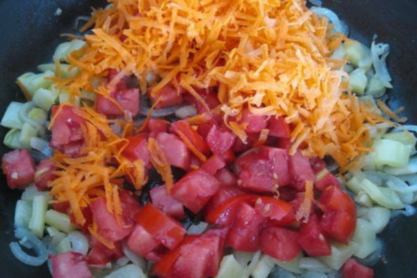 7. grille de tomates lavées sur une râpe grossièreen tenant le légume par la peau, il faudra alors le jeter. Ajoutez cette pâte de tomates aux oignons et aux carottes, mettez également les herbes sèches dans une casserole, salez, poivrez, ajoutez un quart de tasse d'eau chaude, couvrez et laissez mijoter à feu doux pendant trois minutes.