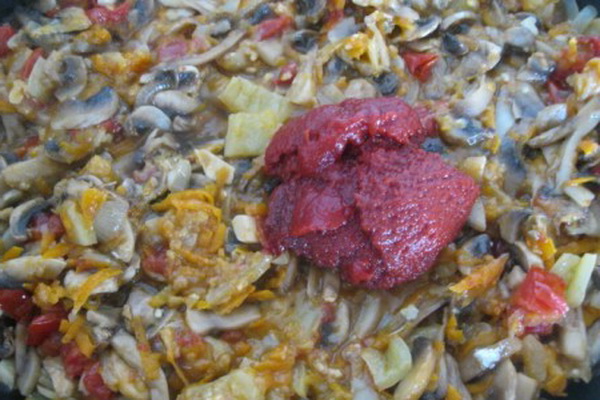 Ajoutez de la pâte de tomate et de la crème sure aux légumes et faites cuire dans cette sauce jusqu'à cuisson complète. Si vous souhaitez que les champignons soient plus tendres, vous pouvez d’abord ajouter un peu d’eau, un ragoût, puis mettre de la crème sure et de la pâte de tomates.