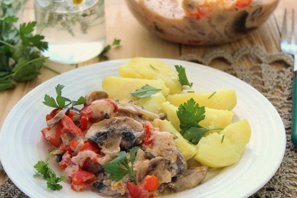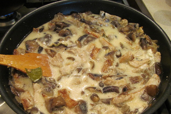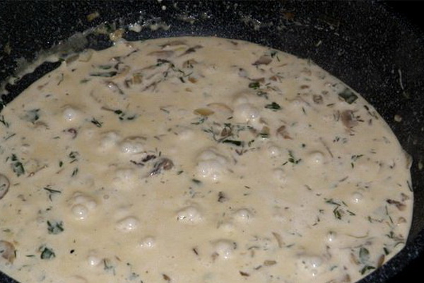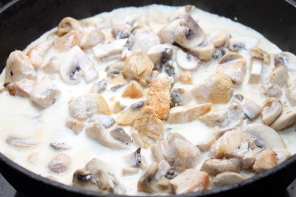 4. Quand le poulet et les champignons sont prêts, égouttez un peu de liquide de la casserole, mais n’avez pas besoin de verser le tout, versez la masse avec la sauce à la crème, couvrez et laissez mijoter 10 minutes à feu doux.
