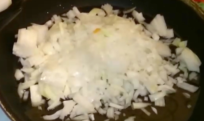 - Les oignons sont coupés en rondelles, disposés dans une poêle préchauffée et frits pendant 10 minutes. à feu moyen jusqu'à coloration dorée.