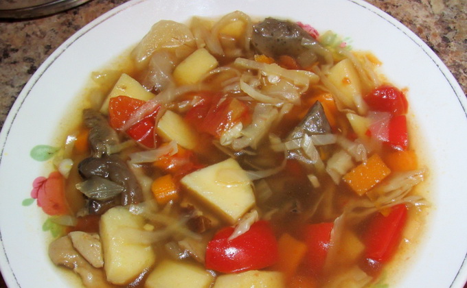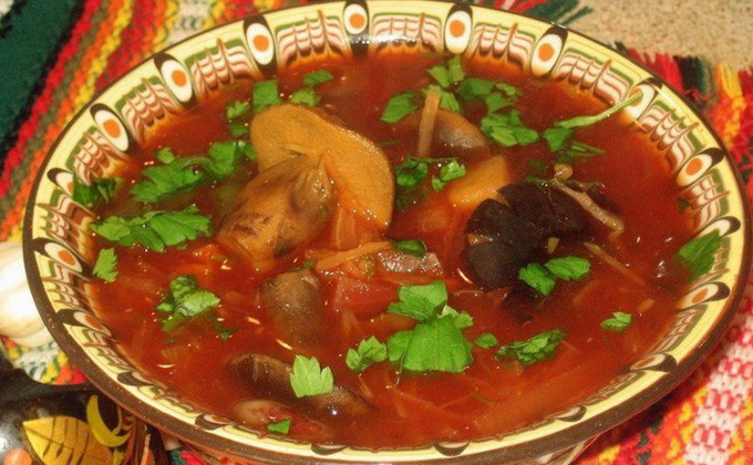 Pré-tremper les champignons séchés pendant 1 heure, laisser bouillir pendant 20 minutes, puis les hacher finement et les mettre dans un bouillon de champignons égoutté. Coupez l'oignon finement, ajoutez de la farine et mélangez pendant 4 à 5 minutes, puis portez à ébullition, ajoutez les tranches de pomme de terre, les pruneaux, les raisins secs et laissez cuire jusqu'à ce qu'ils soient cuits. Servir avec des tranches de citron et des herbes.