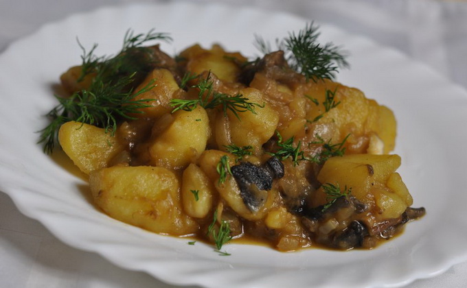 Pommes de terre, nettoyer, laver, couper en gros. Nous mettons la moitié des pommes de terre dans la casserole, puis une couche de champignons sautés aux oignons et à nouveau les pommes de terre. Saler, poivrer et verser de l'eau (~ 0,5 litre). Couvrir et envoyer préchauffé à 170-180 gr. un four pendant 40 à 50 minutes (le temps est approximatif. Tout dépend de la pomme de terre et vous devrez donc essayer d'augmenter le temps de cuisson si nécessaire). À la fin du ragoût, ajoutez une feuille de laurier. Vous pouvez également ajouter du persil ou de l'aneth finement hachés. Très savoureux avec du lait froid.