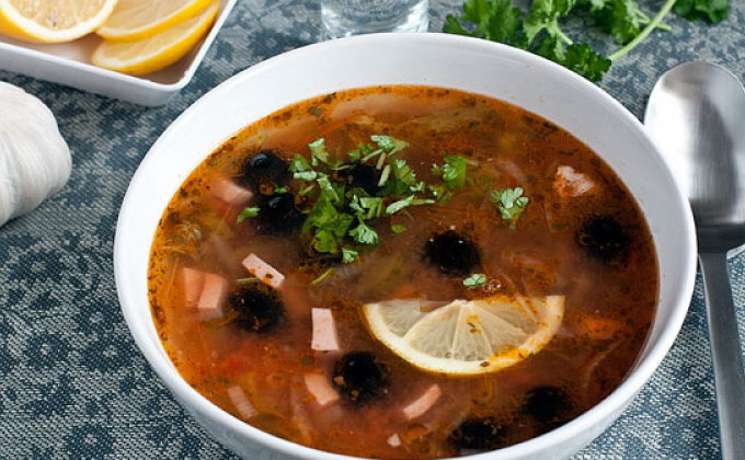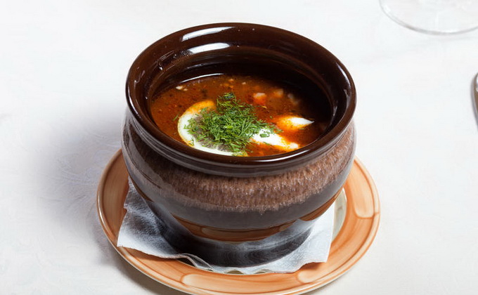 Cuire le bouillon des os, verser dans des pots en argile, mettre le veau tranché et frit, le jambon et les saucisses en morceaux, ajouter les oignons et les champignons hachés et frits. Ensuite, mettez les cornichons hachés et les pommes de terre en dés.