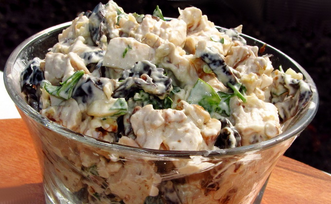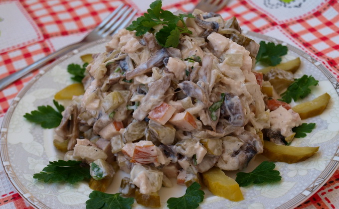 Mélanger tous les composants de la salade, saler et assaisonner avec de la mayonnaise. Placez une lame sur un plat et servez.
